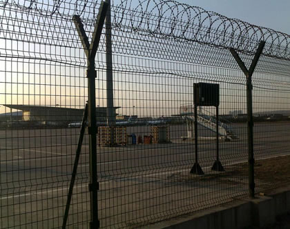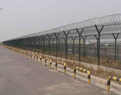 機(jī)場(chǎng)護(hù)欄網(wǎng)又稱(chēng)作“Y型安全防御護(hù)網(wǎng)”,是由V型支架立柱,加強(qiáng)型焊接片網(wǎng),安全防盜連接件和熱鍍鋅刀片刺籠組成強(qiáng)度和安全防御性級(jí)別很高。近年來(lái),被廣泛應(yīng)用在機(jī)場(chǎng),軍事基地等高安全場(chǎng)所。注:如果在機(jī)場(chǎng)護(hù)欄網(wǎng)頂部加裝刀片刺絲、刀片刺繩后又很好的增強(qiáng)了安全防護(hù)性能。