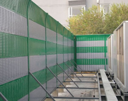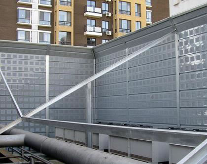 3、聲屏障模塊組合結(jié)構(gòu)簡單, 樣式多種,有頂部為吸聲單元,合理確定聲屏障的長度和高度后,可獲得10-25dB(A)的降噪量。造價低,安裝便捷;空調(diào)機組降噪工程中廣泛使用。