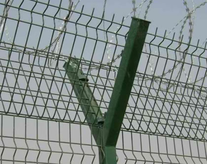 機(jī)場(chǎng)護(hù)欄網(wǎng)又稱(chēng)作“Y型安全防御護(hù)網(wǎng)”,是由V型支架立柱,加強(qiáng)型焊接片網(wǎng),安全防盜連接件和熱鍍鋅刀片刺籠組成強(qiáng)度和安全防御性級(jí)別很高。近年來(lái),被廣泛應(yīng)用在機(jī)場(chǎng),軍事基地等高安全場(chǎng)所。注:如果在機(jī)場(chǎng)護(hù)欄網(wǎng)頂部加裝刀片刺絲、刀片刺繩后又很好的增強(qiáng)了安全防護(hù)性能。